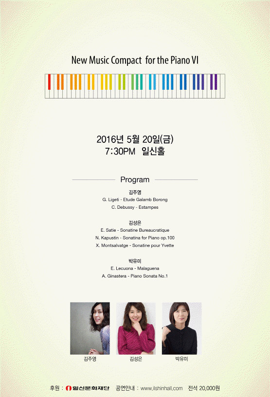 2016년 New Music Compact for the Piano VI에서는 피아니스트 김주영, 김성은, 박유미가 동양적 음색을 다룬 리게티와 드뷔시의 작품, 사티, 카푸스틴, 몽셀바헤의 20세기 소나티네, 레쿠오나와 히나스테라의 열정적인 남미 음악을 선보입니다.